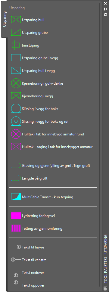 Du kan velge å tegne utsparing for hull og grube, innstøpninger, slissing, kjerneboring, hull/saging i himling, samt utvendig grøfting. I tillegg brannteknisk og lydteknisk tetting av gjennomføringer, Lag E411-B og -L. Som vist over utsparing med målsetting og "E" for elektroutsparing.