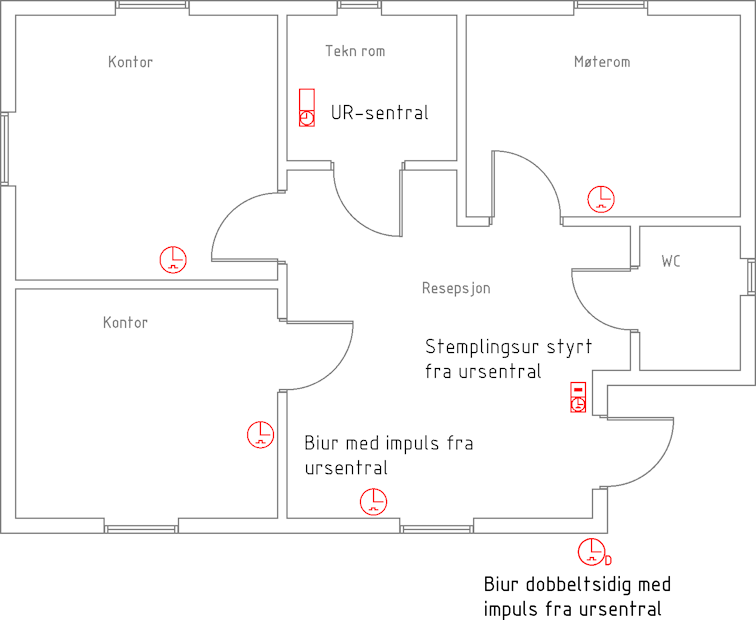 Uranlegg og tidregistrering inneholder symboler for diverse ur, enkeltsidig, dobbeltsidig, stemplingsur, både for styring fra ur-sentral, og med eget utverk. I tillegg resultattablå og styrepult for evt idrettsanlegg, etc. Noen av symbolene har også 3D