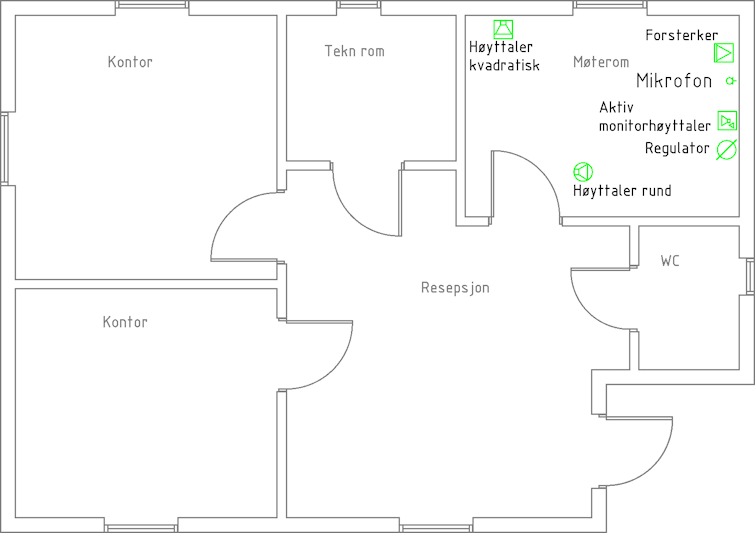 Lydanlegg inneholder symboler for utstyr til bruk ifm scener/store saler og rom.