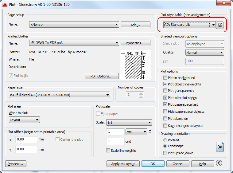 Dersom du skal plotte i målestokk 1:100 bør du lage et oppsett med bredde 0,18 mm i stedet for 0,25 mm.