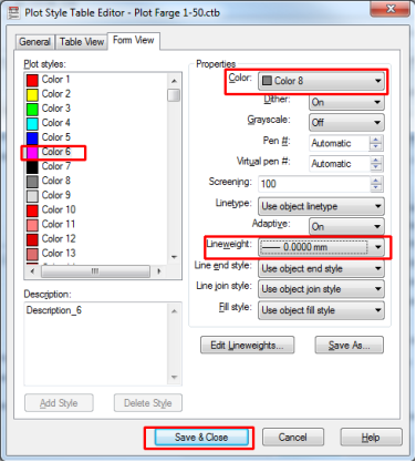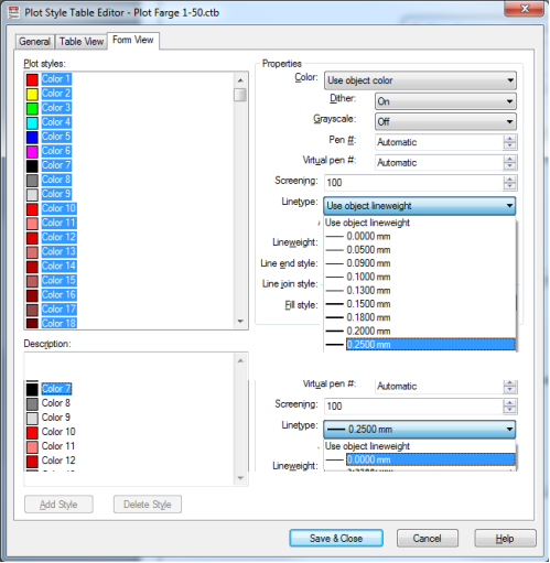 I Plot styles merker du alle penner og velger Lineweight 0,25 mm. Derett kun farge 7 og Lineweight 0,00 mm. Deretter Save & Close. For å lage sort-hvitt oppsett går du inn på samme oppsett.