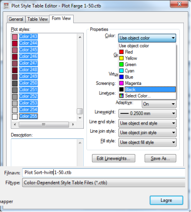 Du merker alle Plot styles farger, klikk på Color under Properties og velg Black. Trykk på Save As... og lagre under nytt navn Plot Sort-hvitt 1-50. Da har du de to oppsettene for å lage 1:50 tegninger. Noen vil ha med føringsveier på alle plantegninger i tynn strek. Velg da farge og bredde som f.eks.:
