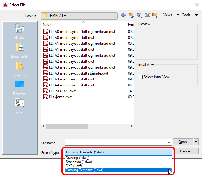 Standard ELI malene kan endres. For å endre en mal, åpnes disse ved å velge filtype: Drawing Templates (*.dwt)