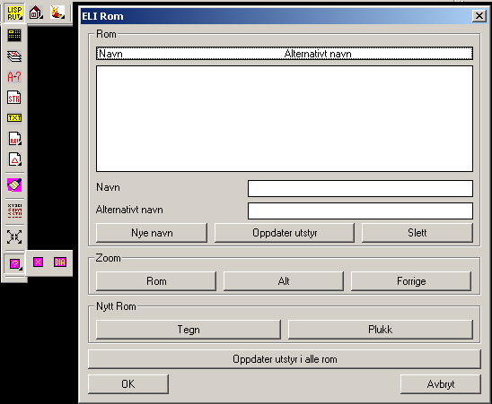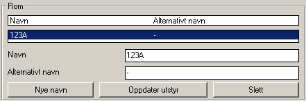 Peker du på et rom i dialogboksen, kan du forandre navnet og ved å skrive i boksen og trykk Nye navn og attributtene oppdaterer seg med nytt rom-nummer.