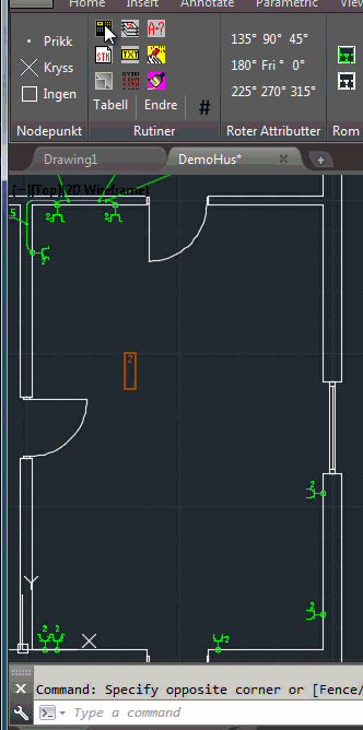 Når du har tegnet en PLINE langs med vegg i et rom (eller kopiert Areal-laget fra arkitekttegningen og satt inn i din tegning) velger du Plukk og peker på PLINE’en - se kommandolinjen.
