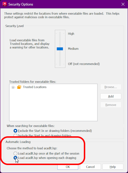 Under 'Options -> Security Options' kryss av for å laste lisp for hver tegning.