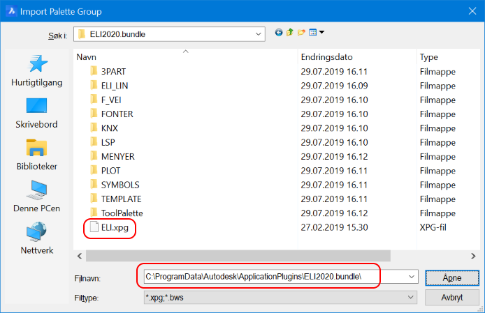 NB! Hvis det allerede finnes en gruppe som heter ELI, fjern denne før du importerer en ny. Hvis du ikke får tilgang til å slette ELI-palettgruppen, velg "All Palettes" før du åpner dialogen. Dette gjelder spesielt ved oppgradering til