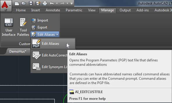 Kortkommandoene ligger i fil som heter ACAD.PGP/ACLT.PGP. Du kan selv gå inn å legge til egne kortkommandoer ved å åpne denne filen.