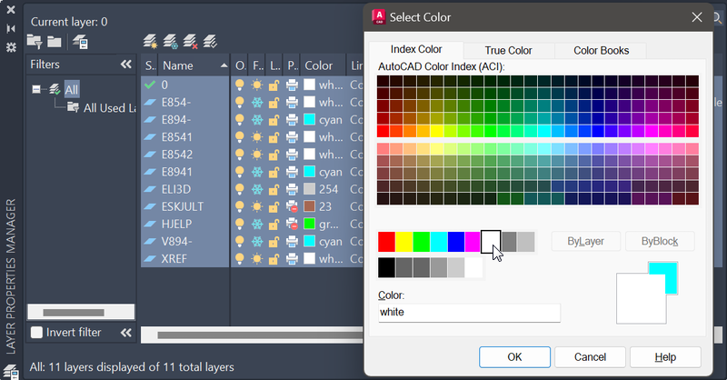 Hvis noen entiteter fortsatt har en annen farge enn hvit kan du bruke kommandoen: "SETBYLAYER". Kommandoen vil sette verdien "ByLayer" på farge, linjetype, linjebredde og setter også ByLayer på entieter inne i blokker. Hele grunnlagstegningen skal da være hvit.