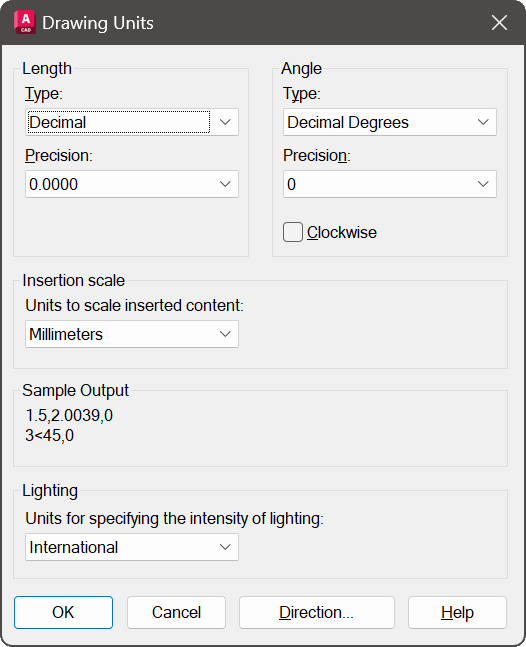 Sjekk hvordan enhetene er satt opp. Dette sjekker vi med kommandoen "Units". Da kommer dialogen for tegne-enheter opp. Her ser vi at enhetene er satt til millimeter. Vi lukker dialogen og sjekker om en kjent avstand stemmer. Her kan vi bruke kommandoen "DIST" for å måle en kjent avstand. Vi måler da avstanden mellom to punkter. Hvis avstanden ikke stemmer kan man velge å skalere her eller skalere når man setter inn tegningen som xref.