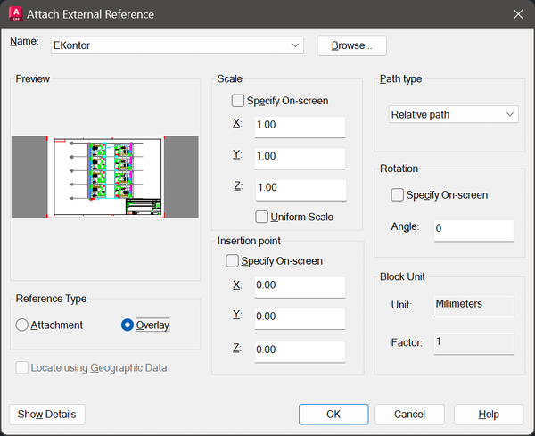 For å lage tegningen som vi skal bruke til å planlegge elektro-installasjonen, starter vi med en blank tegning som er basert på prototypetegningen “ELI ISO”. Vi legger til grunnlagstegningen på elektrotegningen med kommandoen "XREF" og velg "Attach DWG" fra panelet. . Grunnlagstegningen må alltid plasseres i origo når vi legger den til. Sørg for at du ikke har krysset av for "Specify On-screen". Vi skal bruke samme null-punkt som grunnlagstegningen.