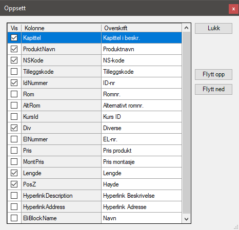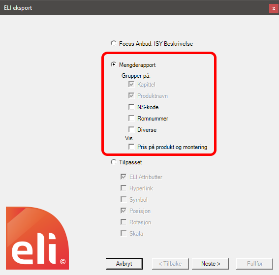 Utvidet kontroll på hvordan mengderapporten til Excel skal se ut. Du kan styre om rapporten skal grupperes på NS-kode, romnummer, og diverse-attributt. Du kan også velg om pris på produkt, montering og sum skal vises. Alle blokker i dag har en attributt som heter Kapittel. Den bruk nå ikke lenger, men hentes fra blokken sitt lagnavn. Endringen i rapporten gjelder både ELI LT og ELI PRO.