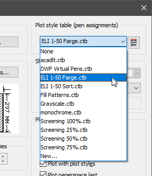 To penneoppsett, "ELI 1-50 farge" og "ELI 1-50 sort". Grunnlagstegningen (farge 7) blir til tynnstrek mens de andre fargene blir strektykkelsen satt til 0,25 mm.